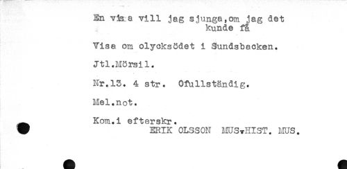 //// En visa vill jag sjunga,om jag det //// kunde få //// Visa om olycksödet i Sundsbacken. //// Jtl.Mörsil. //// t //// Nr.13. 4 str. Ofullständig. //// Hel.not. //// ^ Kom.i efterskr. //// W ERIK OLSSON MUS-rHIST. MUS. ////
