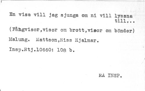 //// ... //// En visa vill jag sjunga om ni vill lyssna //// till... //// (Fåhgvisor,visor om brott,visor om bönder) //// Malung. Mattson,Niss Hjalmar. //// Insp.Rtj.10660: 108 b. //// i //// + //// HA INSP. ////