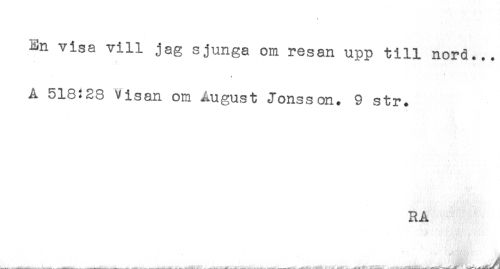 //// t //// En visa vill jag sjunga om resan upp till nord... //// * //// A 518:28 Visan om August Jonsson. 9 str. //// RA //// ... . . -- . . . . ^ ....... . .......<..., .. . .^h .... ____---' ////