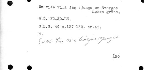 //// Em visa vill jag sjunga om Sverges //// norra gräns, //// 8:5. FÖ-JO-LE. //// r //// S.L.S. 46 s.137-139. nr.48. //// N. //// ÅBO ////