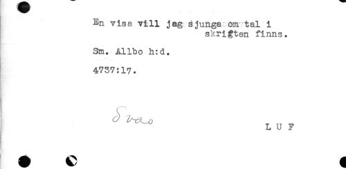//// En visa vill jag sjunga om tal i //// skrigten finns. //// Sm. Allbo h:d. //// 4737:17. //// L U F //// * å ////