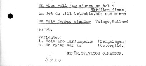 //// En visa vill jag sjunga om tel i //// ^ om det du vill betrakta,hör och mimns //// (Ht) //// De tolv dagens stunder Veinge,Halland //// s,255. //// Varianter: //// 1. Tolv äro lärjungarna (Bergslagen) //// 2. En råder väl än (Ostergtld.) //// STR ÖM.SV.VISOR 0.RAMSOR. //// L_____. . . , .... ////