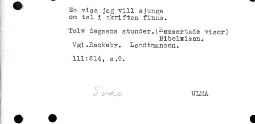 //// ^ En visa jag vill sjunga //// om tal i skriften finns. //// Tolv dagsens stunder.(Ramsartade visor) //// Bibelgisan. //// Vgl.Rackeby. Landtmanson. //// 111:214, s.9. //// r) UI2.IA ////
