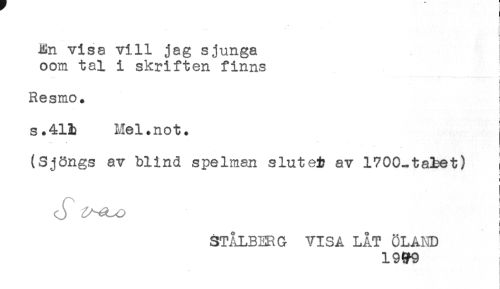 //// Rn visa vill jag sjunga //// oom tal i skriften finns //// t //// Resmo. //// t //// f //// } //// s.41b Mel.not. //// (Sjöngs av blind spelman slutei? av 1700-ta3bet) j //// ] //// STÅLBERG VISA LÅT ÖLAND //// 19^9 ////
