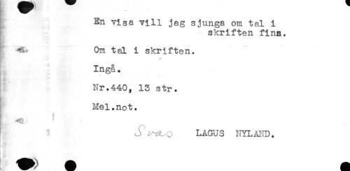 //// En vi sa vill jag sjunga om tal i //// skriften fina. //// § //// ^ Om tal i skriften. //// - //// Ingå. //// Nr.440, 13 str. //// Mel.not. //// ^ ynA^o LAGUS NYL^H). ////