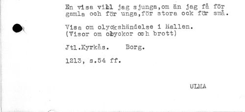 //// im visa V142.L jag sjunga,um an jag ia i ur- //// gamla och för unga,för stora ock far små. //// Visa om olyckshändelse i Hallen. //// (Visor om obyckor och brott) //// Jtl.Kyrkas. Borg. //// 1213, s.54 ff. //// ULMA ////