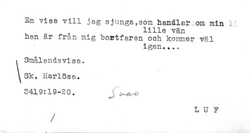 //// Rn vise vill jag sjunga,som handlar;om min 3' //// lille vän //// han är fran mig boatfaren och kommer väl //// igen..,. //// t Smålandsvisa. //// \Sk, Harlösa. //// 3419:19-20. ^ //// L U F //// //// /