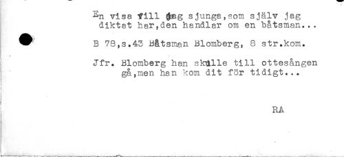 //// Sn visa till gsag sjunga,som själv jag //// diktat har,den handlar om en båtsman... //// ^ B 78,s.43 Båtsman Blomberg, 8 str.kom. //// t * //// Jfr. Blomberg han sk&lle till ottesången //// I ' gå,men han kom dit för tidigt... //// !-, - //// RA //// - ////