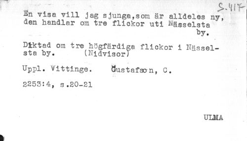//// ^.n visa vill jag sjunga,som är alldeles ny, //// den handlar om tre flickor uti Nässelsta //// by. //// ! . //// D&ktad om tre högfärdiga flickor i Nässel- //// sta by. (Nidvisor) //// - ^ //// Uppl. vittinge. dustafson, C. //// 2253:4, s.20-21 //// ULMA //// ^ < ////