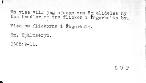 //// En visa vill jag sjunga som är alldeles ny //// hon handlar om tre flickor i fägerhulta by. //// . //// i //// Visa om flickorna i #ägerhult* //// Sm. Hjälmseryd. //// 5623:9-11. //// < //// i //// i //// t //// L U F //// < ////
