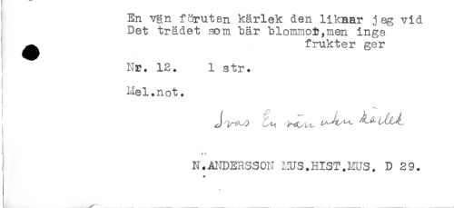//// En van f3rutan kärlek den liknar jag vid //// Det trädet som bär blommoi?,men inga //// ^^ frukter ger //// ! Na. 12. 1 str. //// : Mel.not. //// t //// I //// ^ i //// ! N.ANDERSSON 1'IIS.HIST.MUS. D 29. ////