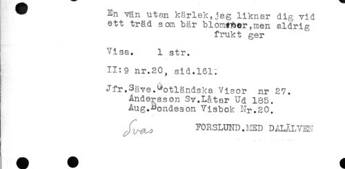 //// vän utan kärlek,jag liknar dig vid //// ett träd som bär blom#7ber,men aldrig //// frukt ger //// Visa. 1 str. //// * //// 11:9 nr.20, sid.161: //// Jfr.Sgve.Gotländska Visor nr 27. //// Andersson Sv.Låtar Ud 185. //// Aug.Bondeson Visbok Nr.20. //// FORSLUND. MED D^Jj^LVm ////