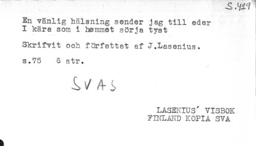 //// En vänlig hälsning sender jag till eder //// I kära som i hemmet sörja tyst //// * //// Skrifvit och författat af J.Lasenius. //// s.75 6 str. //// < //// i //// i //// LASENIUS^ VISBOK //// FINLAND KOPIA SVA //// h ////