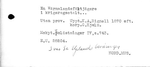 //// En VärmelandsfäH;jägare //// ^^ i krigaregestalt... //// Utan prov. Uppt.K.A.Rignell 1870 eft. //// korp.C.Hjelm. //// ) Mskpt.Soldatsånger IV,s.743. //// E.U. 28204. //// } / NORD. ms. ////