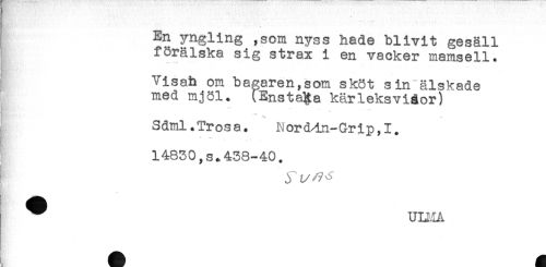 //// En yngling ,som nyss hade blivit gesäll //// förälska sig strax i en vacker mamsell. //// i Vlsah om bagaren,som sköt sin älskade //// { med mjöl. (Enstaka kärleksviåor) //// Sdml.Trosa. Nordin-Grip,1. //// ^ 14830,s*438-40. //// ^ L/ 7 //// ^ ULLIA ////