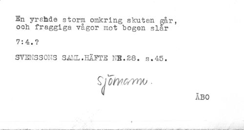 //// En yrehde storm omkring skutan går, //// och fraggiga vågor mot bogen siar //// 7:4.? //// SVENSSONS SA1.IL.HÄFTE NB.28. s.45. //// ÅBO ////