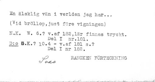 //// En älsklig vän i verlden jag har... //// (Vid bröllop,just före vigningen) //// N.K. W. 6.? v.af 182,lär finnas tryckt. //// Del I nr.181. //// D:o B.K.? 10.4 - v.af 181 s.? //// Del I nr 182. //// ^ R&NCKEK FÖRTECKNING //// (V ////
