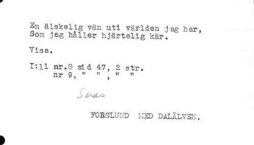 //// En älskelig vän uti världen jag har, //// Som jag håller hjärtelig kär'. //// Visa. //// 1:11 nr.8 sid 47, 2 str. //// nr 9, " " , " " //// FOBSLUND HED DALÄLVEN. ////