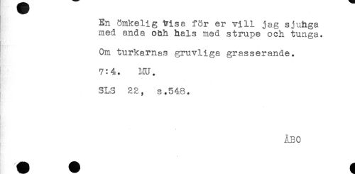 //// En ömkelig trisa för er vill jag sjuhga //// med anda o&h hals med strupe och tunga. //// Om turkarnas gruvliga grasserande. //// 7:4. MU. //// SLS 22, s.548. //// < ////