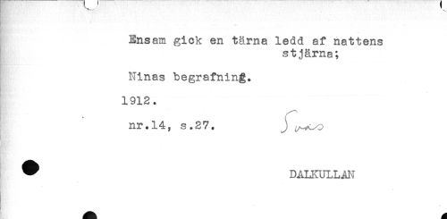 //// Ensam gick en tärna ledd af nattens //// stjärna; //// Ninas begrafning. //// 1912. //// nr. 14, s.27. j ^^ //// ^ DALKULLAN //// K //// /