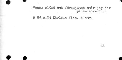 //// Ensam glömd och förskjuten står jag här //// på en strand... //// B 89,s.24 Kärleks Visa. 5 str. //// RA ////
