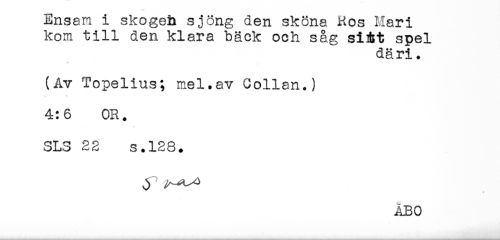 //// Ensam i skogeh sjöng den sköna Kos Mari //// kom till den klara bäck och såg siAt spel //// däri. //// (Av Topelius; mel.av Collan.) //// 4:6 OR. //// SLS 28 s.128. //// ÅBO ////