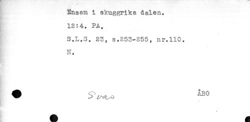 //// Ensam i skuggrika dalen. //// 12:4. PA. //// * - .. //// S.L.S. 23, s.253-255, nr.110. //// * //// N. //// * ^^ ////