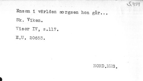 //// . .. : //// ] //// Ensam i världen sorgsen hon går... //// Sk. Viken. //// **** ^ ^ * . . //// Visor D7, s.117. //// E.U. 20653. //// NORD.ms. ////