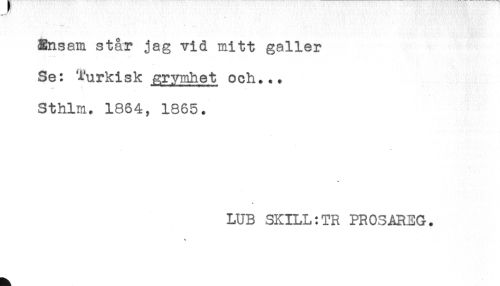 //// - //// Ensam står jag vid mitt galler //// Se: Turkisk grymhet och... //// Sthlm. 1864, 1865. //// t //// LUB SKILL:TR PR03AREG. ////