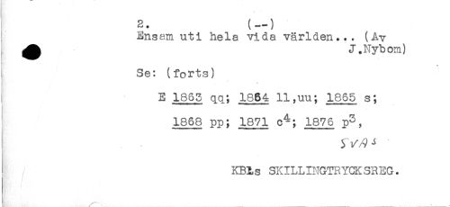 //// Ensam uti hela vida världen... (Av //// ^^ J.Nybom) //// ! * * //// - //// i Se: (forts) //// ! " ' //// E 1863 qq; 1864 11,uu; 1865 s; //// ' 1868 pp; 1871 c^; 1876 p^, //// KBLs SKILLINGTRYCKSREG. //// ; //// ......._ .....^... ////