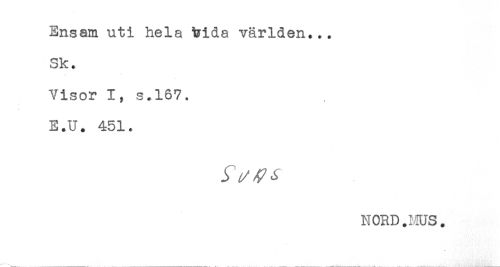 //// Ensam uti hela i?ida världen... //// Sk. //// Visor I, s.167. //// E.U. 451. //// NORD.HUS. ////