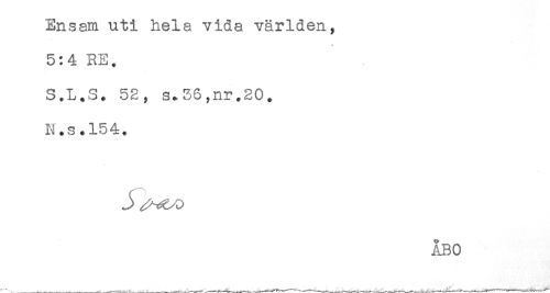 //// Ensam uti hela vida världen, //// * //// 5:4 RE. //// S.L.S. 52, s.36,nr.20. //// N.s.154. //// .... //// ÅBO ////