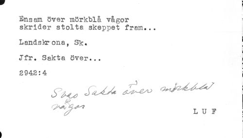 //// < //// Ensam över mörkblå vågor //// skrider stolta skeppet fram... //// ! //// % //// i //// Landskrona, Sk. ! //// i //// Jfr. Sakta över... i //// 2942:4 j //// ^^ L U F ////