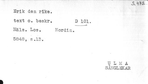 //// Erik den rike. //// text o. beskr. 0 101. //// - _ . , //// Häls. Los. Nordin. //// 5848, s.15. //// U L M A //// SANGLEKAR ////