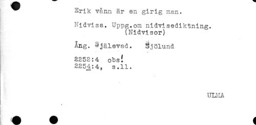 //// ^ Erik vann är en girig man. //// Nidvisa. Uppg.om nidvisediktning. //// (Nidvisor) //// Ang. ^jälevad. Sjölund //// 2252:4 obs! //// 2254:4, s.ll. //// ULIsIÅ ////