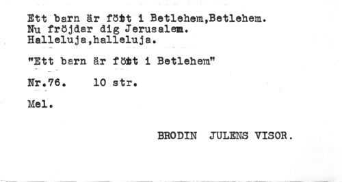 //// Ett barn är fö&t i Betlehem,Betlehem. //// Nu fröjdar dig Jerusalem. //// Halleluja,halleluja. //// "Ett barn är fött i Betlehem* //// Nr.76. 10 str. //// Mel. //// BRODIN JULENS VISOR. ////