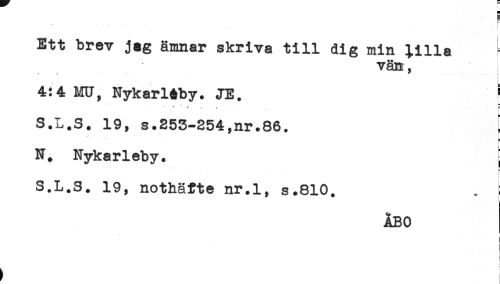//// Ett brev jag ämnar skriva till dig min lilla //// vän, //// i //// 4:4 MU, NykarlAby. JE. ^ //// ' . , = //// S.L.S. 19, s.253-254,nr.86. ! //// Nykarleby. j //// r //// S.L.S. 19, nothäfte nr.l, s.810. . } //// ÅBO //// < ////