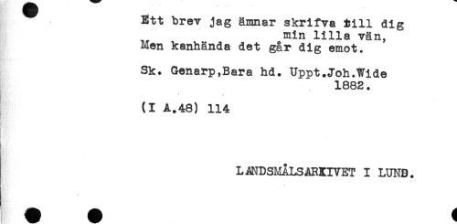 //// Ett brev jag ämnar skrifva till dig //// min lilla vän, //// Men kanhända det går dig emot. //// Sk. Genarp,Bara hd. Uppt.Joh.Wide //// 1882. //// (I A.48) 114 //// LANDSMALSARKIVET I LUND. //// w ////