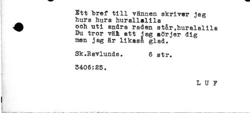 //// Ett bref till vännen skriver jag //// hura hura hurallalila //// A och uti andra raden står,huralalila //// Du tror väh att jag sörjer dig //// men jag är likaså glad. //// f //// Sk.Ravlunda. 6 str. //// < //// < //// 3406:25. //// Q //// ! //// L U F ////