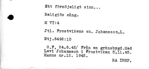 //// Ett förnöjeligt sinn... //// ^ Religiös sång. //// M VI:4 //// Jtl. Frostvikens sn. Johansson,L. //// Rtj.6492:10 //// ^ ^ . * ^ - * .. .. ^ . //// O.F. 24.6.42/ Från en gränsbygd.Med //// Levi Johansson i Frostviken 5.11.45. //// Manus nr.12. 1945. //// RA INSP. //// ......-...- -_____ ' ____ ////