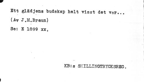 //// Ett glädjens budskap helt visst det var... //// (Av J.M.Braun) //// < //// Se: E 1899 xx, //// ! //// j //// ! //// i //// KB:s SKILLINGTRYCKSREG. ////