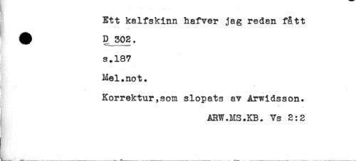 //// Ett kalfskinn hafver jag redan fått //// # D 302. //// s.187 //// Mel.not. //// t-, 1 ... //// Korrektur,som slopats av Arwidsson. //// i-. //// ARW.MS.KB. Vs 2:2 //// * ////