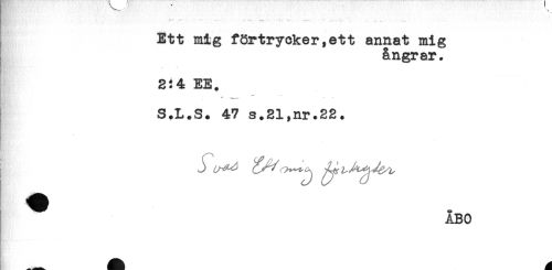 //// 1"* - " - - **- - ... - - -- * ... . .. , , . ^ //// Ett mig förtrycker,ett annat mig //// ångrar. //// EE. //// S.L.S. 47 s.21,nr.22. //// ^ ÅBO ////