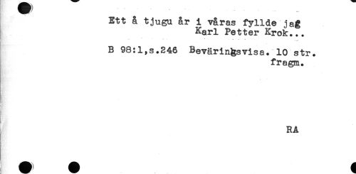 //// ____ //// Ett å tjugu år i våras fyllde jag //// Karl Pe 11 er Krok... //// -- . - . - .. - . , //// ' //// f //// B 98:1,s.246 Bevärin^svisa. 10 str. //// fragm. //// - //// //// /RA ////