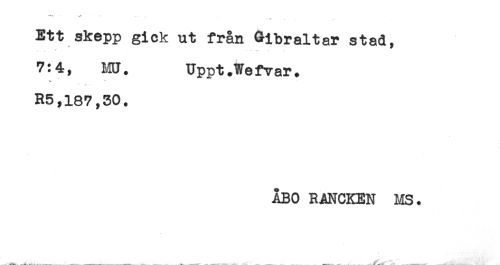 //// -*<**- - . . - ...... //// ' --* . .. //// Ett skepp gick ut från Gibraltar stad, //// 7:4, MU. Uppt.Wefvar. //// t . //// R5,187,30. //// ÅBO RANCKEN MS. ////