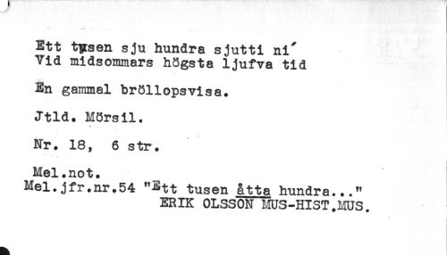 //// Ett tysen sju hundra sjutti ni' //// Vid midsommars högsta ljufva tid //// En gammal bröllopsvisa. //// Jtld. Mörsil. //// Nr. 18, 6 str. //// - . //// Mel.not. //// Mel.jfr.nr.54 "Ett tusen åtta hundra..." //// ERIK OLSSON MUS-HIST.MUS. //// i //// i //// ! ////
