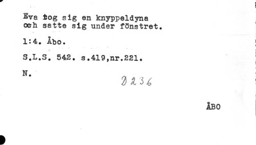 //// Eva tog sig en knyppeldyna //// och satte sig under fönstret. //// 1:4. Åbo. //// ) //// . * * * * ! //// S.L.S. 542. s.419,nr.221. //// ! //// ÅBO ////