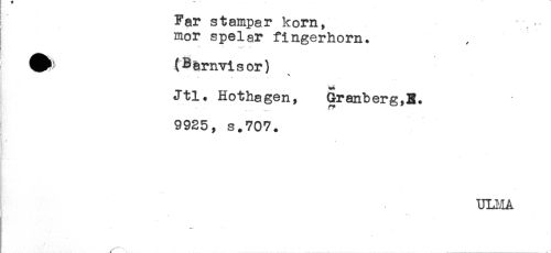 //// Far stampar korn, , - //// I mor spelar fingerhorn. //// E ... - . < //// (Bernvisor) //// * . . //// Jtl. Hothagen, Granberg,B. //// 9925, s.707. //// < //// ULI.1A //// / \ ___ " ////