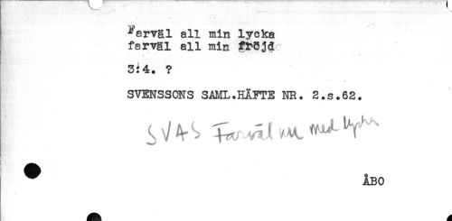 //// Farväl aU. min lycka //// farväl all min fRBjd //// f //// 3:4. ? //// << //// SVENSSONS SAML.HÄFTE NR. 2.S.62. //// ^ ÅBO ////