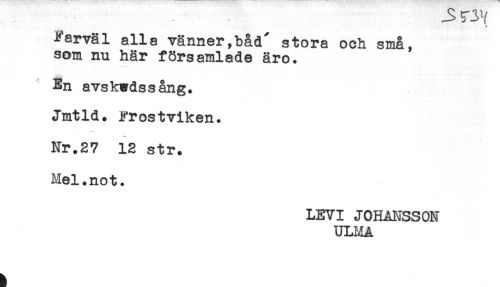 //// Farväl alla vänner,båd' stora och små, //// som nu här församlade äro. //// En avskwdssång. //// Jmtld. Frostviken. //// Nr.27 12 str. //// Mel.not. //// LEVI JOHANSSON //// ULMA ////